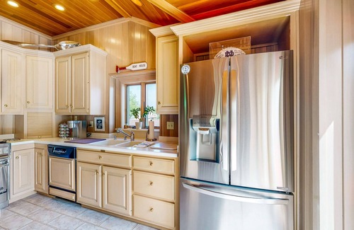 Upon entry, you'll be met with a bright interior and a cozy atmosphere throughout the well-appointed living area, blanketed in natural light. Relax and make yourself at home by resting on the plush furniture, indulging in a movie marathon on the large TV, or serving brunch on the patio. Prepare grand meals and lake picnic snacks in the sophisticated kitchen, equipped with stainless steel appliances, a wine fridge, ample cupboard room, and a breakfast bar. Comfortable beds in spacious bedrooms ensure that everyone will receive a wonderful night's rest from the day's adventures, with bayfront windows for the ultimate view.