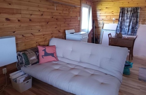 The sleeping area boasts a comfortable queen-size bed and a convertible double-bed futon, allowing the cabin to accommodate up to 4 guests. In the separate bathroom, you'll find a shower, laundry facilities, and all the essential amenities to make your stay comfortable.