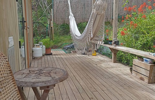 High ceilings with skylight . Block out blinds for sleeping. Single level . Super king size bed also a fold out couch bed. Private garden. Off road parking. 2 person Hammock for relaxing. Unlimited water supply. Claw foot bath with shower. Fireplace.