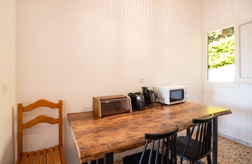 The kitchen is fully equipped with all the essentials needed. It features convenient appliances, including a toaster, coffee maker, washing machine, microwave, refrigerator, stove/hob, and oven, giving the flexibility to dine in or out if that is desired.