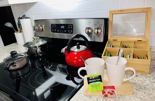 Fully equipped kitchen with microwave, smooth top stove, Keurig, Drip Coffee Maker, Hot Water Kettle, Blender, Toaster, and Sandwich Grill.