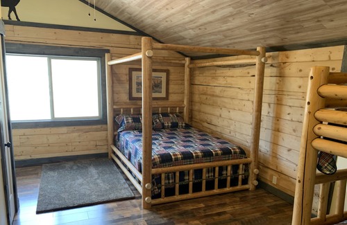 There are 2 bedrooms and 2 full baths. Bucks Room has a Queen bed and a twin bunkbed. The Bears room has a twin over queen bunk and a twin over twin bunk bed.