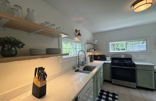 Kitchen - The kitchen is fully appointed and has been modernized with a new refrigerator and new gas range along with a modernized look to enjoy cooking or grilling "at home" for a night. Equipped with hexclad frying pan, saucepans, Cuisinart cooking utensils, and forged stainless knife set. Staple cooking condiments and spices are provided and the coffee bar has a Keurig coffee station for convenience as well.