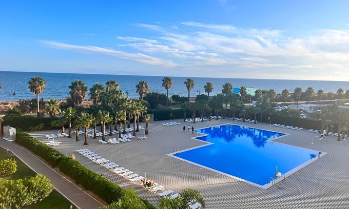 Nice apartment on the beachfront, overlooking the sea and swimming pools and garden areas.