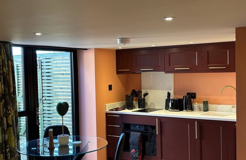 Isla's Den - is an attached guest suite to the main house, with EV charging (£25 additional cost per charge) and its own private entrance with key safe, boasting a private secure courtyard garden suitable for pets (£40 additional cost per pet per stay) with a log fired Sauna (£50 per stay/per week) It features a double ensuite bedroom with Smart TV, a selection of board games, plus a kitchenette which has a Nespresso machine, fridge, microwave/combi oven, hob and dishwasher. Guests have shared use of the lake garden and filtered, spring fed, 30m x 8m natural swimming lake. Guests may use the 5 acre field during their stay which includes a level lawn for ball games.