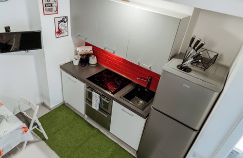 MODERN KITCHEN: The apartment features a modern, fully equipped kitchen with an induction cooktop. It also includes a tea maker and a coffee machine, offering all the amenities you need for a comfortable stay.