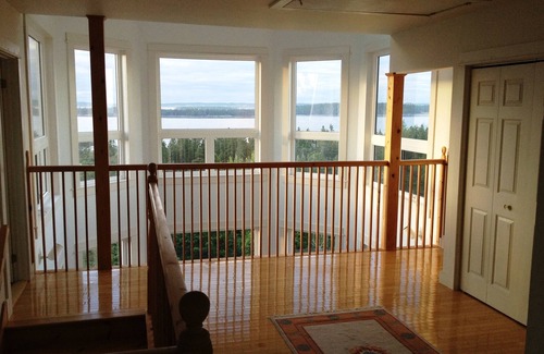 Enjoy the views from 3 decks -- a wraparound deck accessible off the great room, a smaller deck off the den, and a balcony off both the master bedroom and study. Relax listening to the seagulls, watching fishing boats in the bay, sunrises in the morning, sunsets at night, a full moon and stars across the sky, and view deer and small fox which roam the property.
