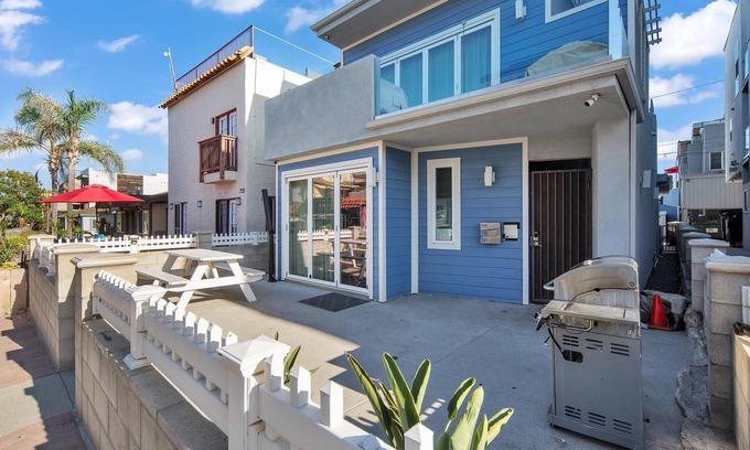 The property features two units with a total of 4 bedrooms and 3 bathrooms, comfortably sleeping up to 16 guests. Enjoy high ceilings and modern amenities including stainless-steel appliances, smart TVs, and stylish furnishings throughout. The outdoor areas feature a first-floor patio and a second-story balcony deck ideal for intimate gatherings or pre-wedding celebrations, all while enjoying gorgeous views of the Mission Beach boardwalk and the Pacific Ocean. Additional amenities like a fully stocked kitchen, ample parking, and concierge service enhance your stay, ensuring every detail is taken care of for your special occasion.