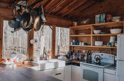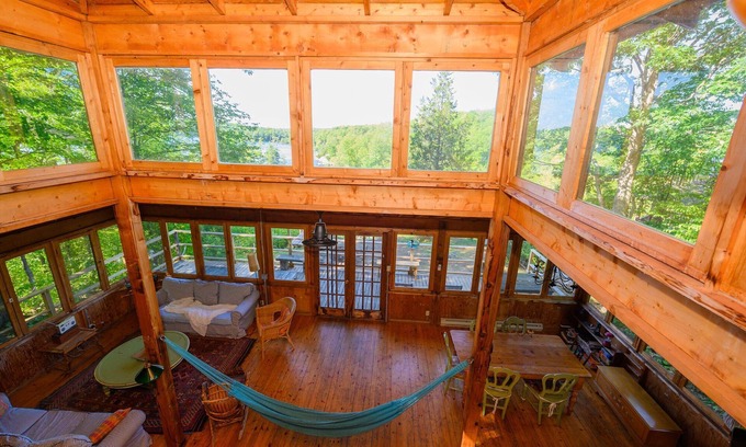 In the main cottage, you’ll be wowed by the free-flowing floor plan, gleaming pine floors, double-height vaulted ceilings, and windows so high you can see the treetops. Gather around the wood-burning stove to play chess, board games, and puzzles, take an afternoon nap on the hammock, or challenge your loved ones to a ping pong competition.