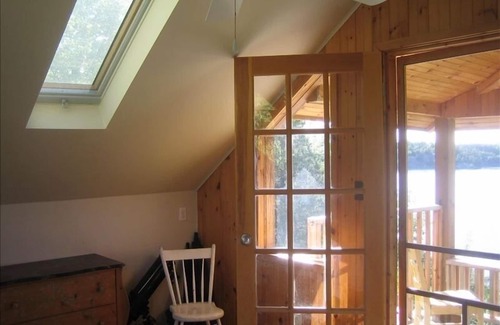 The guest cottage sits a few yards away from the main cottage. Downstairs, the large living room can be used as a dormitory as it has 4 single beds. Upstairs is a beautiful bedroom with a queen-size bed, air conditioner, telescope, skylight that opens, and a covered porch with a gorgeous view of the lake. There is a bathroom in the guest cottage, which has a compost toilet, and there is also an outdoor shower.
