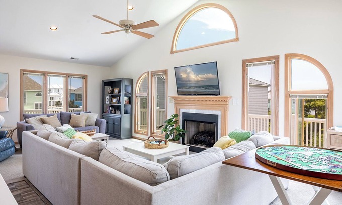 Third Floor: Enjoy gorgeous views and an open feel in the great room. Relax in the Living Area featuring ample seating for your group, an electric fireplace, game table perfect for a family puzzle or card games, a Queen Sleeper Sofa, Flat Panel TV, and access to the deck spaces with furniture on this level. Enjoy dining together in the Dining Area which provides seating for 10. BYOB! Partake of your favorite beverages with the provided Wet Bar and Wine Refrigerator. You will certainly be ready cook those seaside meals with the Fully Equipped Kitchen including everything you need for your family meals including a Refrigerator with Attached Ice Maker, Toaster, Microwave, Dishwasher, Slow Cooker, and bar seating for 8. A Full Shared Bath is also available on this level.