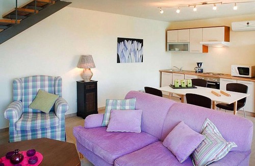 Layout: open kitchen(stove, hob(4 ring stoves, ceramic), electric kettle, toaster, coffee machine, oven, dishwasher, fridge-freezer), Living/diningroom(TV(satellite), DVD player), Bedroom with bathroom(double bed, shower, toilet, hairdryer), grill, washing machine, air conditioning, terrace, garden furniture, parking, deckchairs, parasol, swimming pool(private, outside), high chair, baby crib(free)