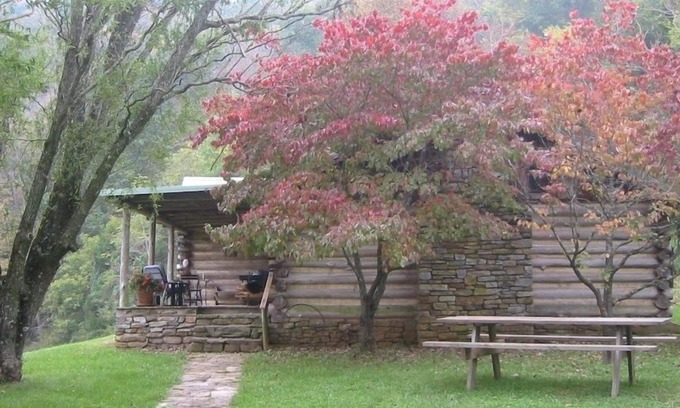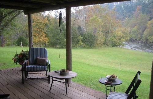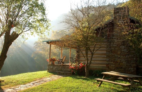 The Cabin on the River features cozy sleeping arrangements for up to eight guests, with two full-size beds in one room, a queen bed in another, and a spacious king mattress loft. Gather around the stone fireplace in the large main room or take advantage of the fully equipped kitchen to prepare meals with your loved ones. The porch is perfect for sipping coffee while enjoying the serene views of the river, and the charming decor, including old iron beds and handmade quilts, adds a romantic touch to your celebration. Laughter still echoes through the trees, creating a joyous backdrop for your wedding festivities.