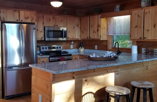 The fully equipped kitchen, featuring stainless appliances and granite countertops, invites you to create memorable meals—whether a romantic dinner served on handcrafted pottery, a hearty pot of chili for the family, or apple pies after a visit to nearby orchards. The dining area seats six, with additional bar seating for casual gatherings.