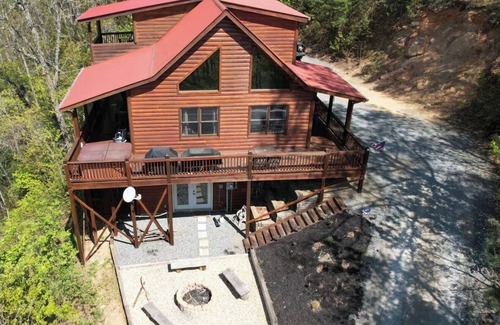 Eyrie-The nest of an eagle, typically built high on a cliff or peak; a human dwelling in a similar place. Escape to your own private Eyrie nestled 2,100 feet atop Roundtop Mountain in our abundantly provisioned and cozy 3-bedroom, 3-bathroom cabin. Complete with a game room, fire pit, and hot tub, this retreat promises relaxation and fun.