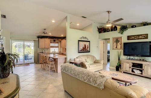 Sunshine and sand, fishing and boating It's all here in beautiful SW Florida. Enjoy this beautifully decorated home located in a quiet convenient location. Entering through a screen front lanai with beautiful plants, Large Great room and open floor plan, Super large Master suite offers queen bed, Lg. walk in closet, slider doors leading to lanai, master bath W/jacuzzi jetted tub and new walk in shower & dual sinks. Bed rm. 2 is the blue room, queen bed decorated to make you feel like your in the tropics. Bed rm. 3 is the Jungle rm. offering a beautiful Jungle mural and decorations, Queen size bed. Tile flooring through out. Fully stocked kitchen you'll have all the comforts of home. Breakfast bar with 3 stools and High top table for 4. Pool side offers Sunshine and Sunsets, lots of pool toys and floats, 6 lounger chairs for sunning, New Rectangle table with bench seat and 4 chairs under roof and 2 additional chairs w/small table to sit and enjoy the sunsets, gas grill for barbecuing . Beach chairs, umbrella and sand toys for your enjoyment. Small children life vest are available in the garage. Full of Family fun or quiet R & R. Charlotte County has the most pristine water ways in SW Florida, 1/2 hour from the beaches. Sarasota 45 mile north and Fort Myers 40 miles south. We want you to feel like it's your home away from home! Always something to do locally! Experience the Florida lifestyle while on vacation!