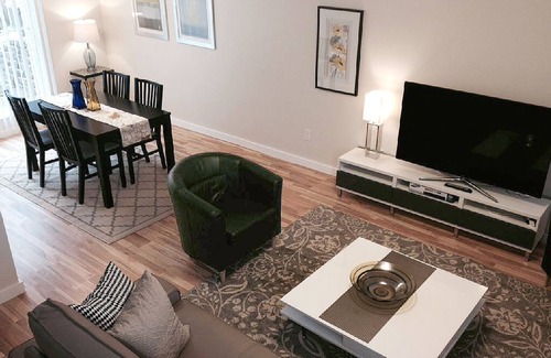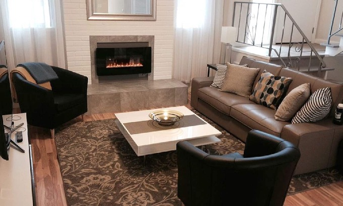 Our living room features premium leather seating, sumptuous pillows and throws, and an electric fireplace. You will also find a brand new 55' Samsung HD television and blue ray player. The living room opens to an elegant dining space that comfortably seats up to six. A sliding glass door leads to a small outdoor patio area where you can enjoy a bit of fresh air and your morning cup of coffee or evening cocktail. The dining room also has a convenient pass through to the kitchen. Outlets on the passthrough are equipped with USB plugs to allow for a second workspace. Enjoy free wifi throughout the entire townhouse.