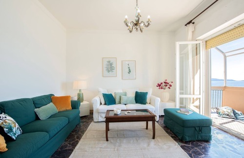 The apartment is furnished with taste and attention to detail, creating a welcoming and refined atmosphere. It consists of a large living room with double sofa bed. From here you access the eat-in kitchen and the balcony equipped for eating outdoors. There are two double bedrooms with sea views and two bathrooms, one with a shower and half bath and the other with double sinks and shower.