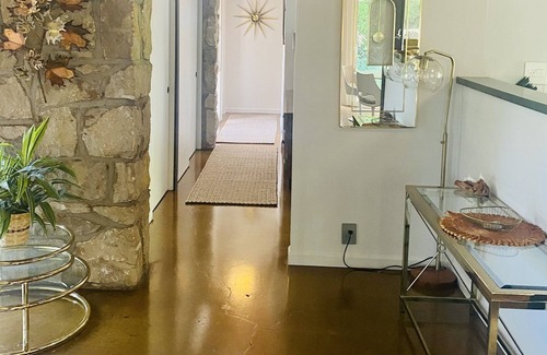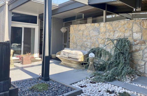 This home is a midcentury mod Donald Drummond entertainers dream with a little midcentury and a little modern design on a quiet street that will make you feel like your staying in California. The house has an Open floor plan with wall of windows - no need to shut the curtains in any room 180 degree full privacy from all neighbors, 6 sliding glass doors, polished concrete floors great for pets, brand new renovated office space full of light a monitor with both seated and standing desks, private backyard with fully 6ft fenced in yard, 4 outdoor seating areas, 2 living areas, formal dining with china if you having a fancy dinner, 3 beds with 2 queen and 1 King, a Full couch pull out bed in 2nd living are for up to 2 additional guests, internet, smart tv/apps (Hulu, Netflix, HBO, Showtime, Disney+, and 200+ channels on Cable). Outdoor amenities include: huge backyard, garden with lots of birds, grill, firepit, TV, lounge seating, dining table, umbrella, water fountain, 2 vintage bicycles, And a Pool - Above ground intex 12’ diameter 36” height - have a number of floats/rafts for guest use.