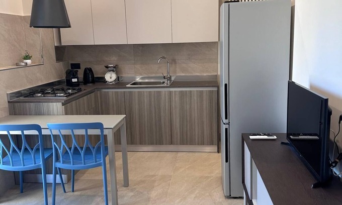 DALIA is the perfect choice for those who love a minimalist style enriched with touches of color. Located at the end of a quiet hallway, this apartment offers a welcoming atmosphere with a spacious, air-conditioned kitchen-living area, decorated with blue accents that bring a fresh feel to the interior. The kitchen is fully equipped with a gas stove, coffee machine, kettle, and refrigerator—ideal for both short and long stays. In the living area, there is also a comfortable single sofa bed that can be used as an additional sleeping space.