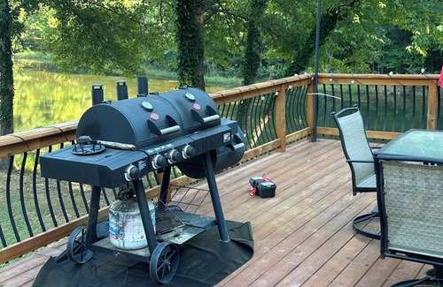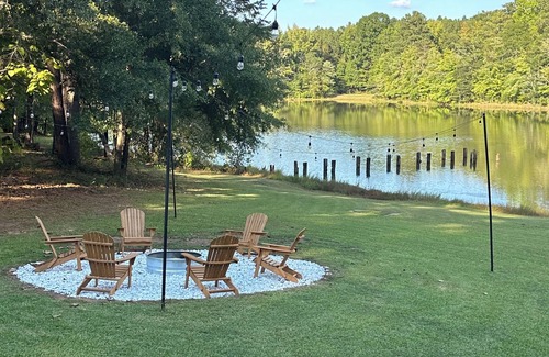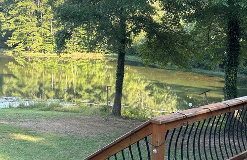 One-of-a-kind property that offers you a way to relax from the big city. The property is surrounded by tall pines on almost 15 acres. Located just minutes from downtown Griffin, GA. This property will not disappoint with its natural views of the lake from the living room. This property is perfect for family gatherings with the huge deck that overlooks the lake and the covered patio with tv outside. Relax with the whole family at this peaceful place to stay.