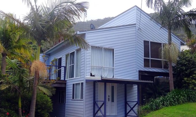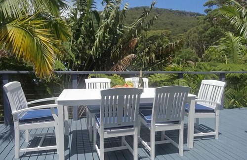 Just one hour from Sydney by car or train, nestled by the world’s second oldest National Park, spectacular Mount Mitchell and pristine beaches. Spacious 3 bedroom house with wide, sun-drenched deck overlooking a tropical garden. Just minutes’ walk to the beach, cafés, shops and train. A romantic, private getaway for up to three couples or ideal for a family, sleeps up to six, with large kitchen, dining and living areas; covered parking.