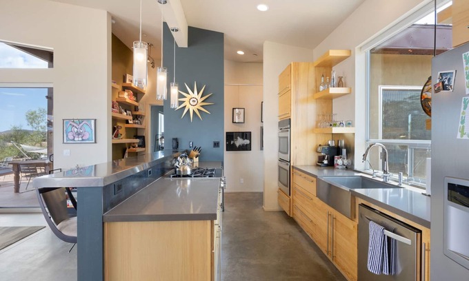 Jackalope Junction is a modern and contemporary home in the rustic and magical Pioneertown - Pipes Canyon area of the High Desert. It's the perfect desert escape for couples, friends, or families. Nestled on an 2.8-acre parcel of land, this modern home is the perfect place to enjoy that “away from it all” feeling. The property is surrounded by boulders and local desert flora and is just a short drive from Pioneertown, Yucca Valley, and downtown Joshua Tree.