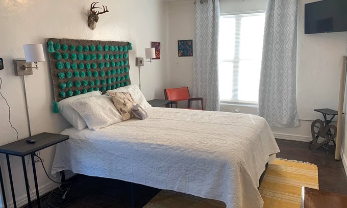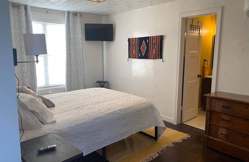 Downtown San Angelo is the place to be! Enjoy a stylish experience at this centrally-located space decorated in West Texas Ranch Style. This is a 350sf private apartment on the 2nd floor of a historic downtown building that shares a hallway and exterior entrance with one other apartment. For 1 or 2 people. Includes a queen bed, full bath, fold down dining table, fridge, microwave, toaster oven and a hot plate. Open concept with lots of light. No living room/seating area but perfect if you're on the go! We limit stays to 3 nights due to the size. Walkable to coffee shops, bars, restaurants, art galleries, yoga and bakeries. 2 blocks from Shannon Medical Center. Park and walk!