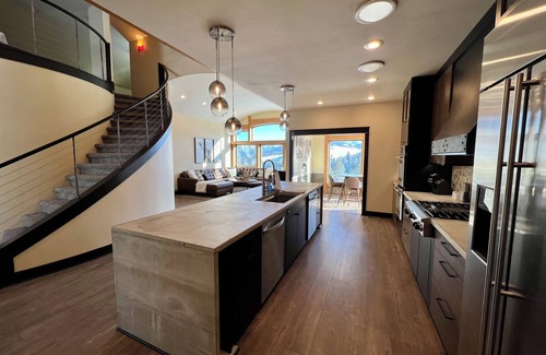 Escape to this mountain home with the whole family, a group of friends, or a company gathering! There is space for everyone in this 5 bedroom home, with 1 bedroom apartment attached (included). Enjoy the gorgeous views and unique architectural features.
