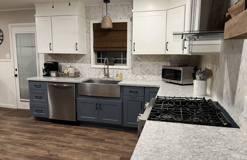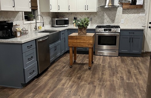 This quaint home abounds in luxury. The gourmet kitchen is perfect for those who like to prepare their own meals. The kitchen is fully stocked with cookware, dinnerware and a Keurig Multi-Brew Coffee Maker. Other kitchen accessories include a large microwave, Toaster, Electric Tea Kettle, Waffle Maker and Slow Cooker.