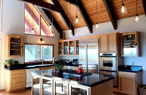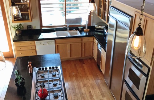 The large gourmet kitchen makes entertaining guests or family easy and enjoyable. Kitchen amenities include a 6 gas burner range, double ovens, an oversized fridge, expansive counter and cabinet space, and all the small kitchen appliances one could need (toaster oven, kitchen aid mixer, blender, etc.). The dining table seats 10 comfortably, and the spacious deck comes with a large Weber gas grill.