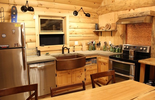 We purchased this cleared lot on an old ski mountain in 2015. The NH sourced log cabin was erected in 2016. We took a basic floor plan and expanded and modified it to fit our active mountain lifestyle. The kitchen includes a farmhouse sink as well as poured concrete countertops. The convertible kitchen table is wood from the UNH lumber mill. The kitchen appliances were purchased for a family that enjoys cooking and eating. The bathrooms were designed and built by us to incorporate the cabin feel. Beds were built using leftover logs. Hot water is an on-demand system. Some of the ski racks in the cabin are our kids' old skis.