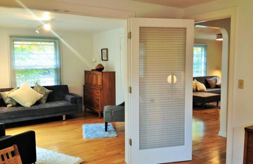 Located in the heart of downtown Eugene, Jackson Star is a spacious light-filled home that provides guests with a beautiful and serene setting to call home while in Eugene. The layout of this home is thoughtfully designed to offer guests an open and inviting place to gather together while simultaneously maintaining features that allow for privacy among your group. Gorgeous wood floors warm the space throughout the home, and the mid-century furniture has been selected for comfort and style. Artwork by local curator and artist, Robert Canaga, enhance this mid-century modern home.