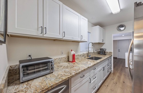 This cozy home offers 2 bedrooms with queen beds plus an additional living room/office with a sofa bed. Sleeps 5 people. Full kitchen w/ dishwasher. Laundry room w/ washer and dryer. And we can't forget the private backyard with a HOT TUB HAVEN!!