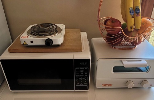 Small kitchenette for your convenience features a mini fridge with freezer, microwave, toaster oven, single burner cooktop, keurig, disposable plates, cups, utensils, grilling accessories, pots, pans, chopping boards, plates, bowls, cups, glasses, seasonings, snacks, water bottles, wine glasses, etc.