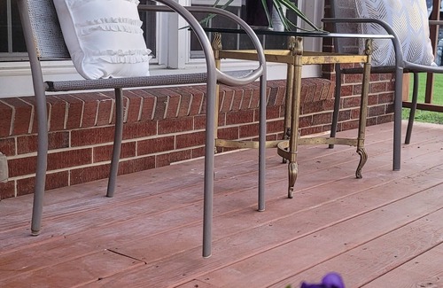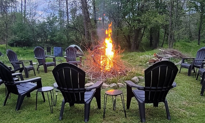 - Have a seat in the camping chairs next to the river and listen to the peaceful trickling sounds of the water running over the river rocks! Fall season update, the leaves tend to fall into the chairs frequently. Please let the host know if extra cleaning is needed on yard chairs.