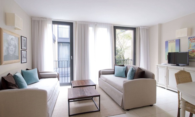 The living area, lit by large windows, has a spacious living room with two sofas that can become comfortable single beds and an elegant dining table that sits six guests.