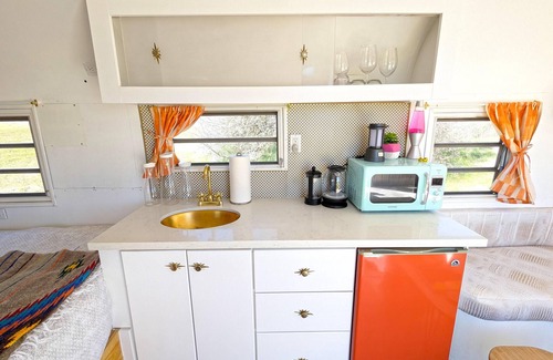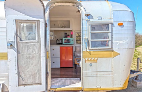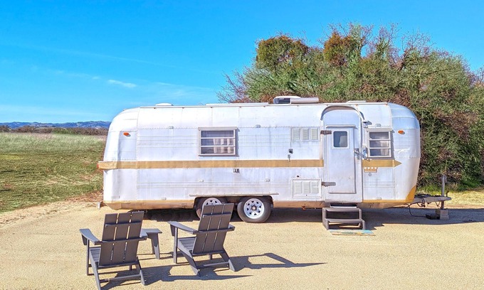 Get ready to groove under the stars and among the vines in Janis, a super cool, fully restored 26' Streamline trailer, named and styled after the one and only Janis Joplin! Youll rest easy in a cozy double bed or kick back on the convertible double couch. The kitchenette has everything you need, from a microwave and mini-fridge to a French press and hot water heater. Spin some vinyl on the record player, and stay comfy with AC and heat. Outside, relax in Adirondacks or dine at the table. Just steps away are five bathrooms with hot showers. Towels, linens, and basic kitchen supplies are all provided. This custom trailer is nestled on a stunning 120-acre vineyard ranch with rolling hills, ancient oaks, and epic sunsets. Enjoy wine tasting, BBQ, fire pits, hiking, frisbee golf, and those magical viewsall just 15 minutes from downtown Paso Robles!