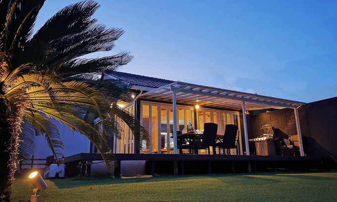 Your stay includes a range of luxurious amenities designed to enhance your experience. Unwind in the authentic Japanese-made barrel sauna or take a dip in one of the two outdoor hot tubs filled with warm, open-air water. For those looking to host a delightful gathering, the property features a covered terrace equipped with an American-made BBQ gas stove, perfect for memorable al fresco dining. The nearby beach allows for marine activities and delightful strolls, ensuring every moment spent here is enjoyable. Pets are welcome too, complete with a private dog run, so your furry friends can join in on the festivities.