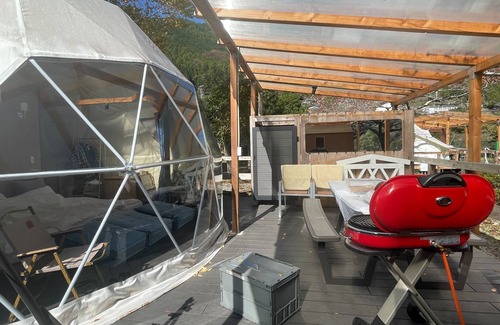 Equipped with BBQ facilities and natural hot springs even beginners can enjoy the outdoors with ease In addition there are activities to enjoy the great outdoors in the surrounding area / The dome side is equipped with a semiopenair bath and a separate toilet so women who are new to the outdoors and small children can spend a luxurious time in peace