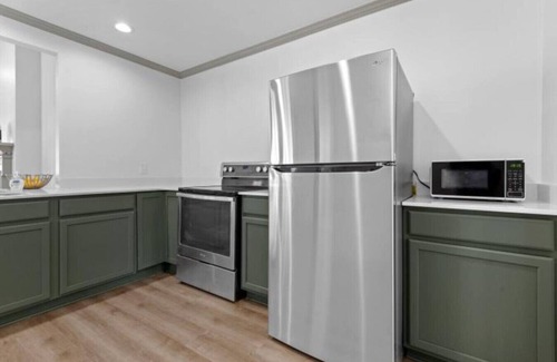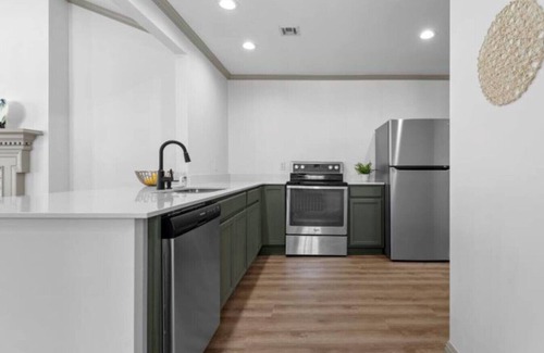 Kick back and relax in this calm, stylish space. This space has a wonderful kitchenette with full fridge, dishwasher, sink and lots of cabinet space! A vanity space, a nice tub and living room with pull out queen size couch, two comfy chairs, large tv and faux fireplace.