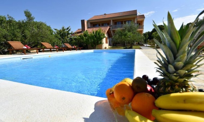 Drage 4 km from Pakoštane: Apartment house "Jasminka". In a quiet, sunny position, 650 m from the sea, 1 km from the beach. For shared use: property 2'900 m2 (fenced), swimming pool angular heated (8 x 4 m, depth 150 cm, seasonal availability: 04.Apr. - 17.Oct.) with internal staircase. Outdoor shower, terrace (45 m2), garden furniture, barbecue. In the house: internet access, washing machine (extra) (for shared use). Parking at the house on the premises. Shop 250 m, restaurant 200 m, bus stop 500 m, pebble beach 1.5 km, rocky beach 1 km, concrete beach 1 km. Cycle lane 800 m. Well-known lakes can easily be reached: Vransko jezero 1.7 km. Swimming pool heated (extra). It is necessary to announce 7 days in advance if the pool heating is required.
