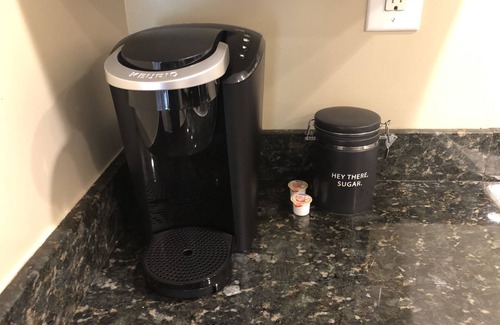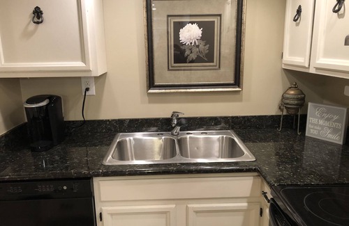 The kitchen features a full size refrigerator, oven, glass cooktop, microwave, dishwasher and sink. It is stocked with dishes and silverware for six guests, along with basic supplies like pots & pans, cutting board, knives, baking sheet, utensils, wine/beer opener and a Keurig coffee maker.