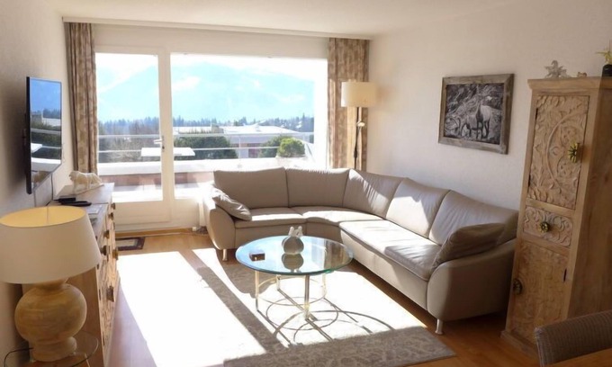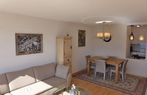 "Jeanne D'Arc Apt. D-33", 2-room apartment 49 m2 on 2nd floor. Comfortable and tasteful furnishings: living/dining room with cable TV, flat screen, radio and CD-player. Exit to the balcony. 1 room with 1 french bed (180 cm, length 190 cm). Exit to the balcony. Small, open kitchen (oven, dishwasher, 4 ceramic glass hob hotplates, toaster, kettle, electric coffee machine, Capsules for coffee machine (NESPRESSO) extra, raclette grill, fondue Set (chinoise, cheese)) with hatch. Bath/WC. Large balcony 22 m2, south facing position. Balcony furniture, deck chairs (2). Very beautiful view of the mountains and the valley. Facilities: hair dryer. Internet (WiFi, free). Garage space n 62, height 200 cm, width 210 cm. Please note: non-smokers only. Maximum 1 pet/ dog allowed.