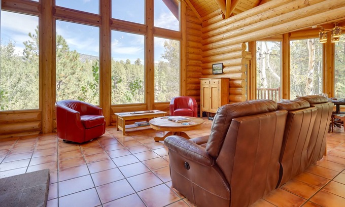 CABIN FEATURES: Great room w/ floor-to-ceiling windows, dining tables, lounge seating, reclining sofa, books, board games, log cabin furnishings, southwestern decor, large loft with game table and sofa