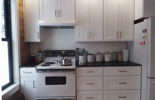 Meticulously renovated with the original wood, but updated with modern amenities, this cozy house has everything you need.one main bedroom downstairs and upstairs bedroom is a finished attic (not super pleasant for adults). The stairs are steep and there is no door at the top, and the ceiling angles down on the sides.Works great for kids !