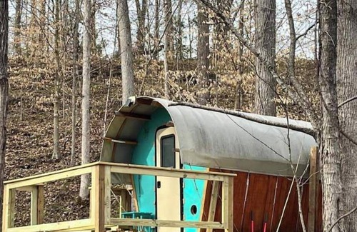 Reconnect with nature at this unforgettable escape. Treat yourself to an amazing getaway in this lovely little covered wagon venue, electric only, detached restrooms, located directly along the banks of the Cumberland River. Enjoy a River view (can be partially obstructed by natural foliage in the height of the summer season as we leave it natural), take in the sounds of nature, birds, the flowing water. Wake up to an amazing sunrise. This cute wagon set up has a queen bed, table, bench seats, coffee pot, picnic table, fire ring, grill and a lovely deck to relax and watch the river flow by… situated in small campground. This is a camping in style type of experience.