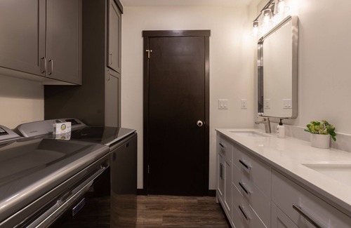 Just down the hall lies a gorgeous detached bath with tile floors, a tile shower/tub, double vanity and ample storage. A washer/dryer joins the bathroom fixtures.