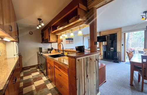 A sliding glass door sits just beyond the dining space, opening onto a patio allowing guests to take in the fresh mountain air.