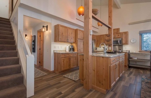 Further in, the living room, kitchen and dining room are combined for one Great Room with large windows and floors in a hickory colored tile; a perfect place for family and friends to gather. The soft leather furniture, wooden lodge chair and reclaimed wood coffee-table create an elegant, cozy space lit by a tree-limb chandelier. The focal point is the European-style wood pellet stove with the flat screen TV hanging above on a white mosaic wall. Additional features include an extraordinary amount of storage space and extra outlets for plugging in electronics; both a bonus for keeping organized and charged on your vacation.